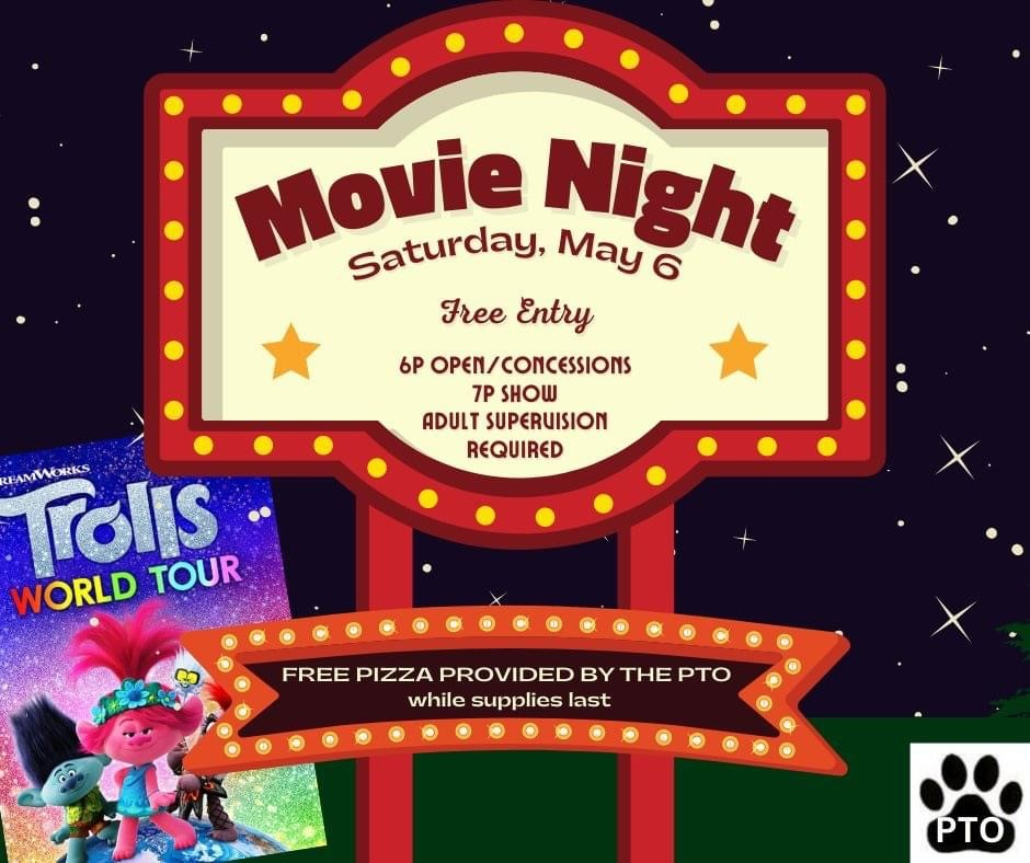 Outdoor Movie Night, Trolls 2: Movie Night, Saturday, May 6, will be on the back lawn and will open at 6pm for you to put a blanket and/or chairs down. The movie starts at 7pm! Concessions will be available for purchase for $1 each. All proceeds will go to Kinship Community Food Center in Riverwest! FREE Pizza will be provided by the PTO (while supplies last). Please note this is NOT a drop-off event! All children must be supervised by an adult and as always, be sure to show off your Cougar Pride; be respectful, clean up after yourselves, and have a wonderful time! Also, a HUGE shoutout to our Outdoor Movie Night sponsor, Jamie Ludlow, Realtor. Thank you for your generosity in supporting a most beloved Cumberland community-building night. Please be sure to stop by her table to grab a free glow stick and say hello! Kids are more than welcome to wear pjs.