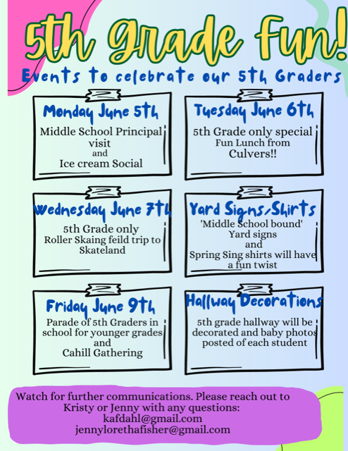 Pre-ordered Yearbooks will be sent home with children today. If you ordered one and didn’t receive one or the yearbook has printing errors, please email: rife002@hotmail.com. For those who would still like to have a yearbook, we are currently waiting on our extras to arrive. We will announce a sale date once they are in our hands. For 5th grade only, if you would like to put your name on a waiting list, you can do so at the office on a first come, first served basis.