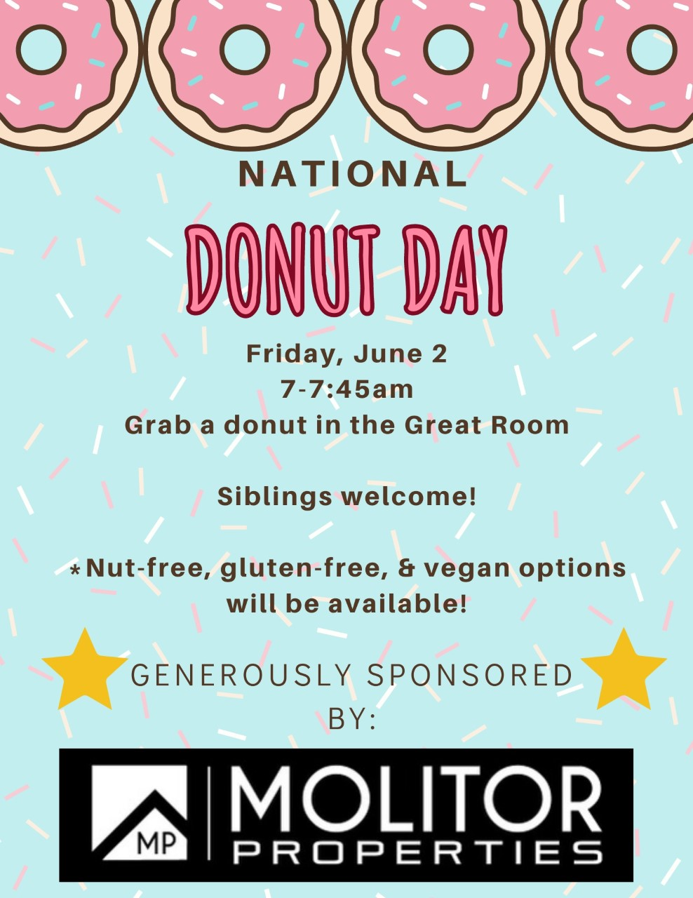The end of the year brings many special events. Friday, tomorrow, is National Donut Day. Saturday is the re-scheduled PTO movie night. Details for both of these are below.
